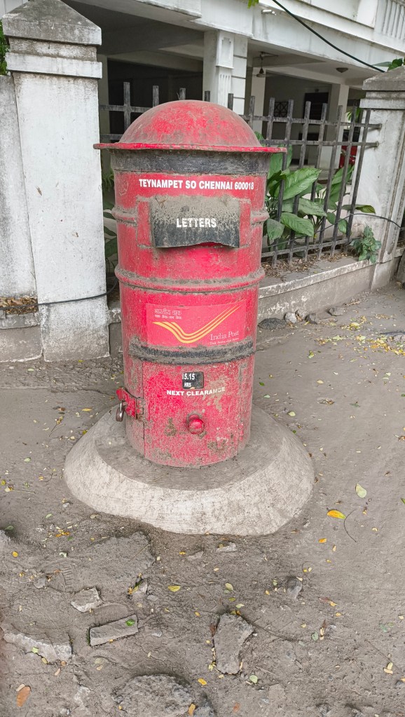 Came across this postbox at Raja Annamalaipuram during my evening walk. Reminded me of Shelley’s Ozymandias. The mighty postbox which over the years served as a portal that kept millions of relationships in tact looks like a superhero during his twilight years. The postbox’s fate is worse than the statue of Ozymandias which survived while nothing around it remained except the desert sand. The world around the postbox has flourished and moved on relegating the postbox to a relic.